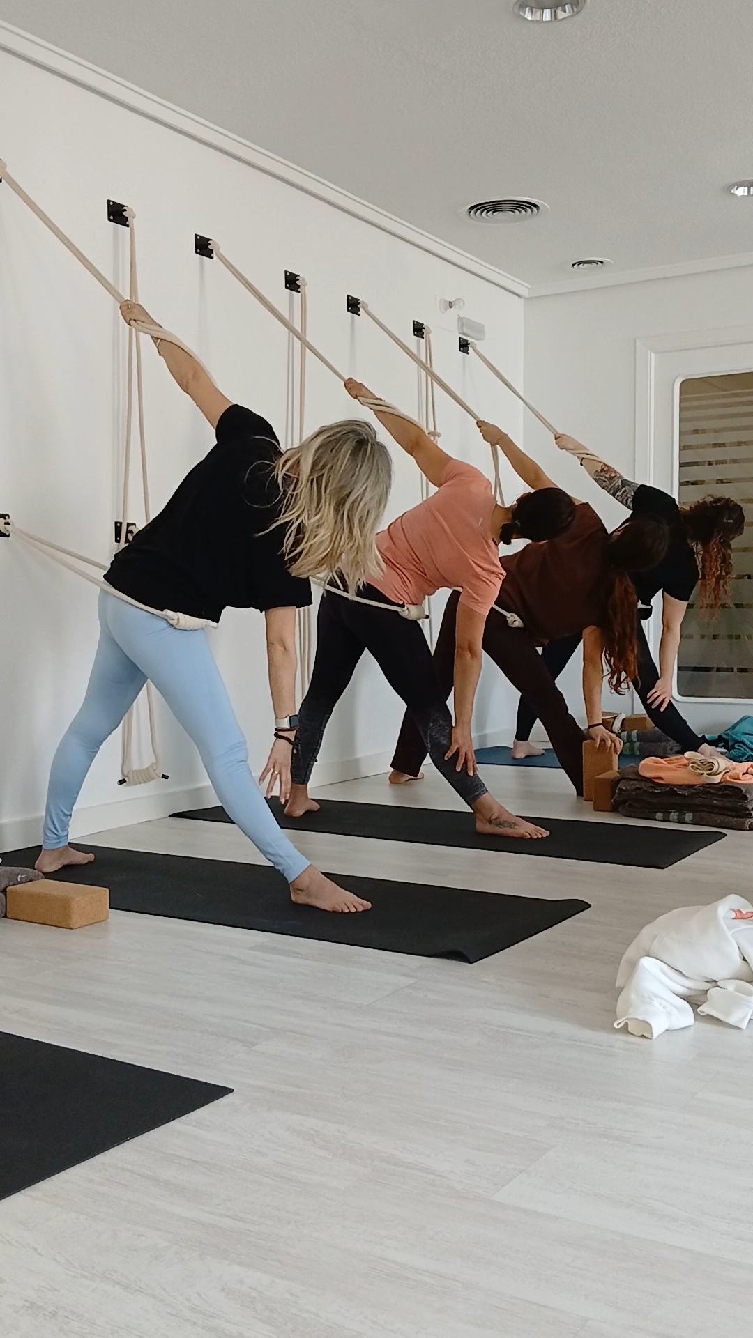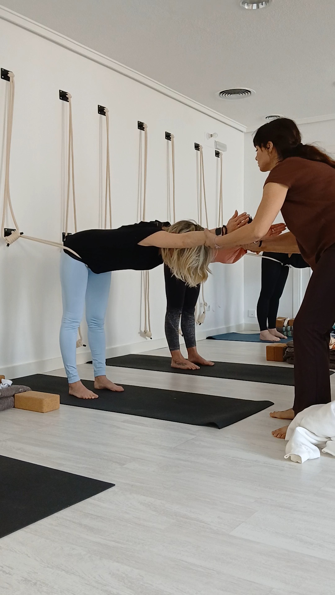 Su origen se inspira en la tradición del yoga clásico y en el trabajo terapéutico desarrollado por maestros que buscaban una práctica más accesible, precisa y respetuosa con la anatomía de cada persona. Gracias al apoyo de las cuerdas, puedes explorar asanas con mayor seguridad, claridad en la alineación y una sensación de ligereza que facilita la respiración consciente.